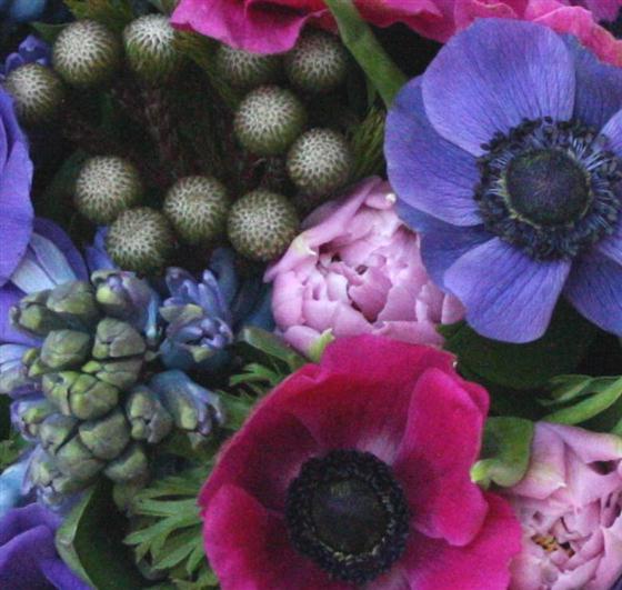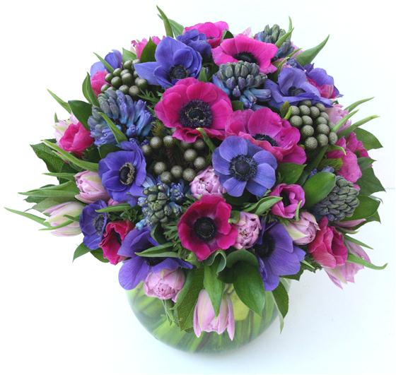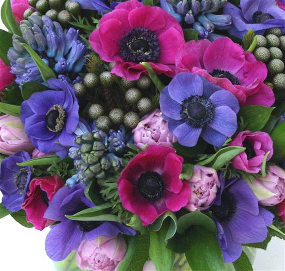 A stunning arrangement of cerise and blue anemones, blue hyacinth and pink tulips finished with albiflora.