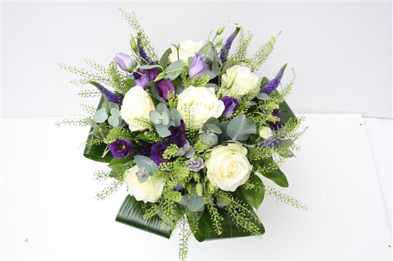 Crips whites and rich purples, a classic colour combination. This stylish bouquet includes roses, veronica and lisianthus.