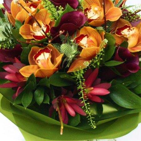 An unusual hand-tied bouquet in shades of deep reds and rusts including cymbidium orchids and calla lilies.