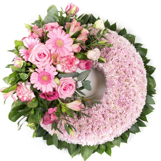 A pastel pink massed wreath with a delicate spray including larkspur, alstromeria, lisianthus and baby pink roses.