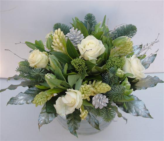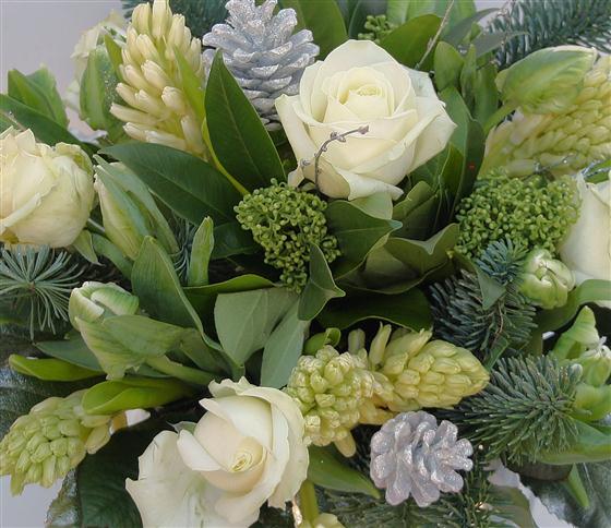 A compact Christmas bouquet of scented hyacinths, roses and tulips, mixed with silver cones and festive foliage.